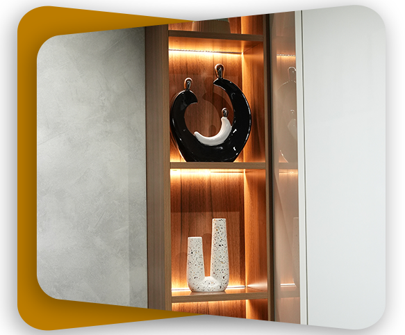 We also provide lighting for specialty areas such as bar counter lights, wall unit lighting, glass shelf lighting, grocery lighting, cutlery unit, and crockery lighting, enhancing the usability of every corner. Our installations feature innovative automation, including hand wave sensor lighting and IR sensor (door sensor) setups for seamless control.